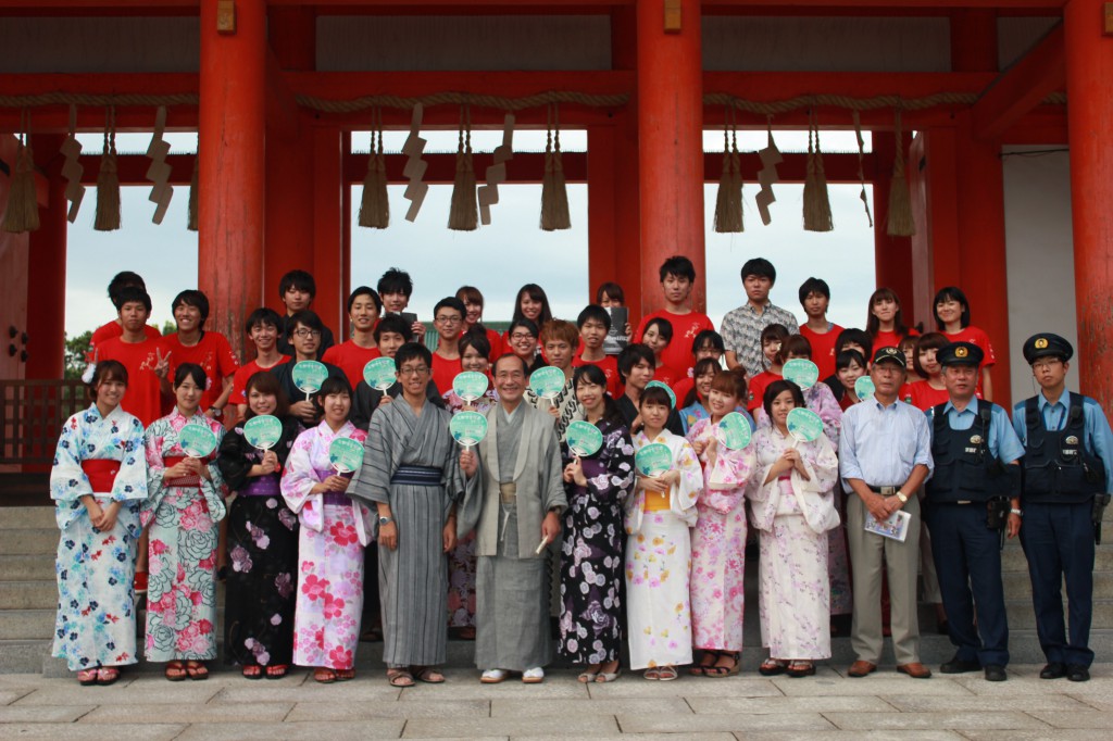 8月27日に岡崎の平安神宮にて打ち水を行いました! 今回は、第12回最後の打ち水ということもあり京都学生祭典とは切っても切れない平安神宮にて行いました。 朝から打ち水日和といえるほどの快晴でした。 そして、今回は約20人の実行委員が浴衣を着てくれました!浴衣で打ち水を行っていることもあり、海外からの観光客の方も一緒に水をまいてくださり、これぞ京都の夏と言う感じでした!