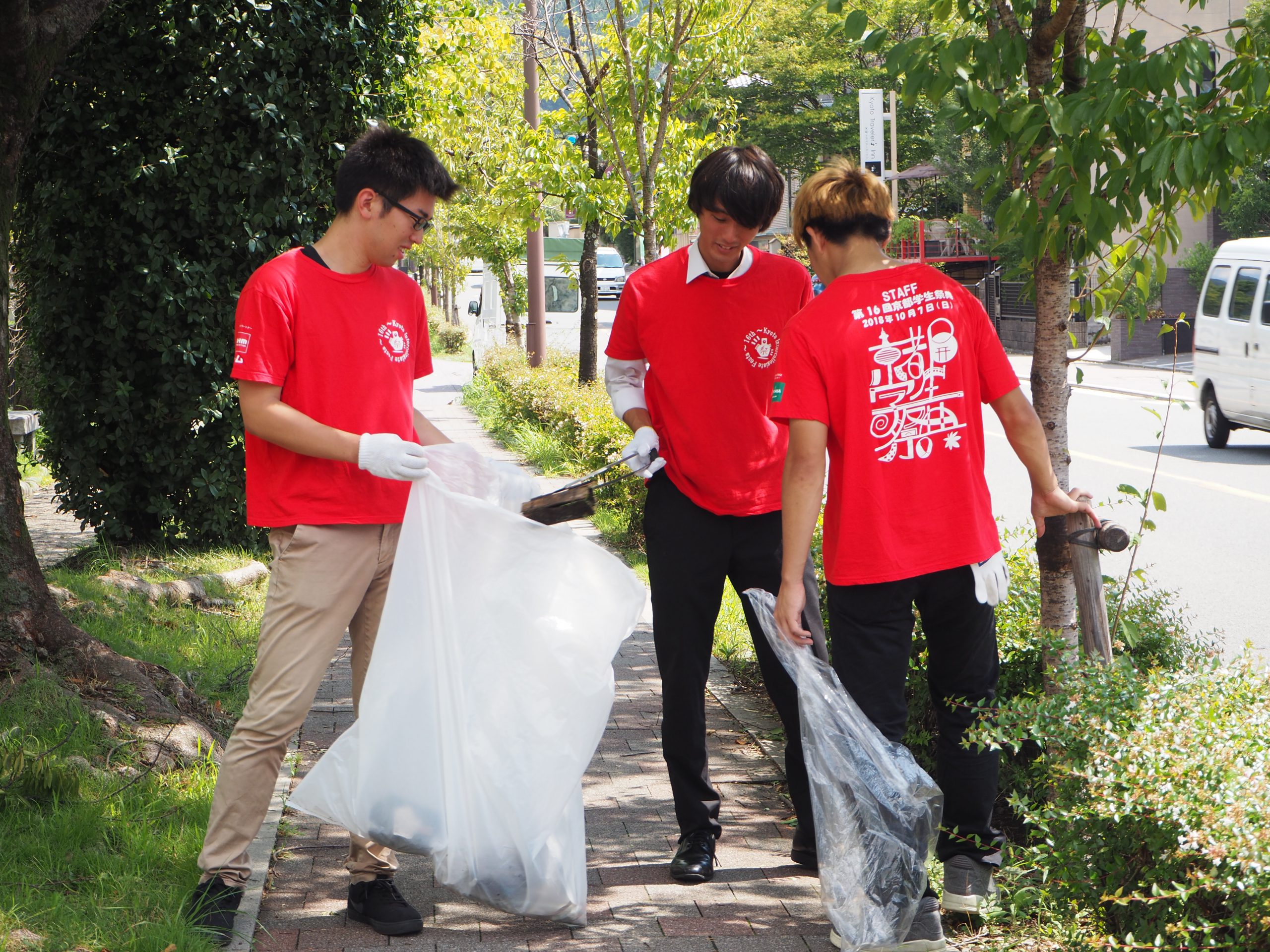 『学生でも今日から始められる環境への取り組み』という意味がある、京都学生祭典発の「KYO-SENSE」をテーマに、環境問題に積極的に取り組んでいます。具体的には、年間を通して京都の清掃活動や打ち水を行ったり、本祭では食ブースの食器に全てリユース食器を使用したりするなど、京都学生祭典は環境にやさしい取り組みも行っています。