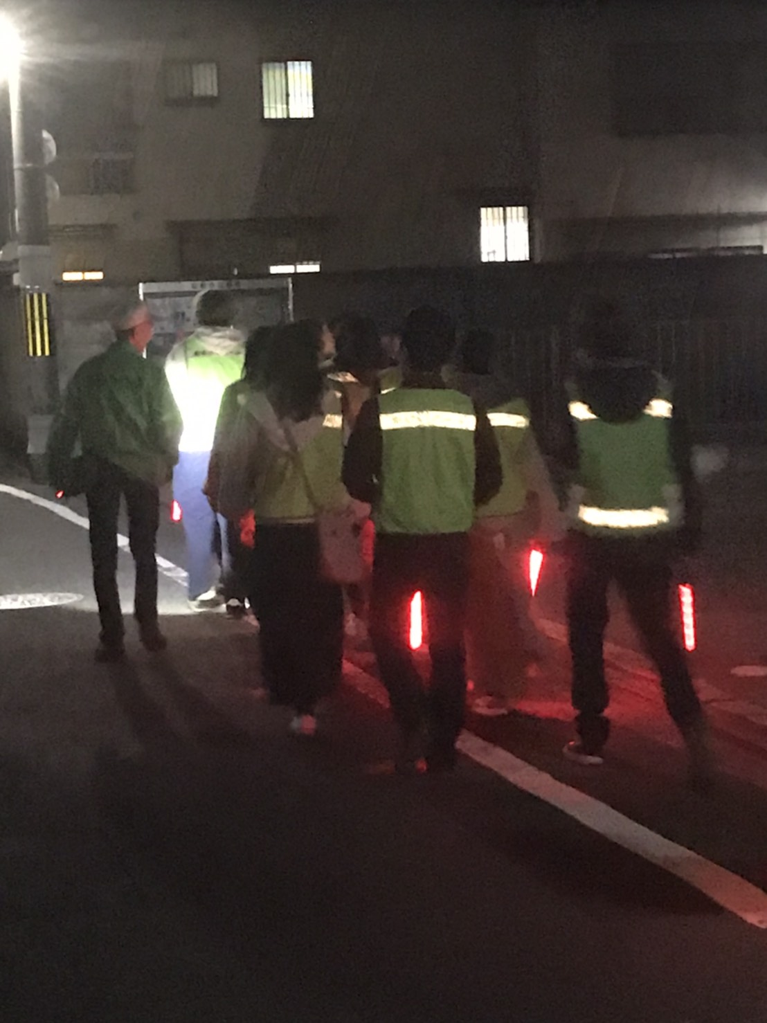 毎月5日と20日に実施される梅逕学区(下京区)と岡崎地域(左京区)の夜間パトロールに、毎回多くの実行委員が参加しています。地域の安全を守る活動をお手伝いし、地域の方々との交流を深めています。