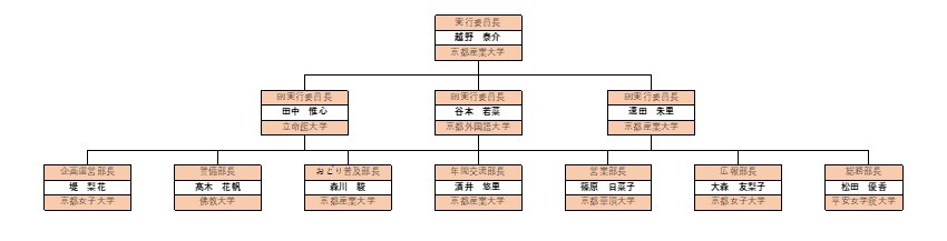 京都学生祭典実行委員会は京都にある20を超える大学・短期大学・専修学校から集まった100人以上の学生によって構成されています。 実行委員会は、実行委員長・副実行委員長を筆頭に、「企画運営部」「警備部」「おどり普及部」「年間交流部」「営業部」「広報部」「総務部」の7つの部署で組織されています。