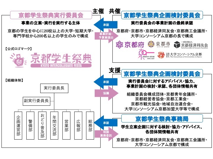 京都学生祭典は、私たち京都学生祭典実行委員会(以下「実行委員会」)が主催し、京都府・京都市・京都商工会議所・京都経済同友会・大学コンソーシアム京都の5団体に共催いただいて成り立っています。 実行委員会と各共催団体は、日頃から綿密な連携を取ることはもちろん、共催団体の皆さまを中心に構成された各種委員会にて協議を重ねることで、京都学生祭典本祭をはじめ様々な企画が実施できるようご支援・ご協力いただいております。 また、京都学生祭典実行委員会は、中心となって組織を引っ張っていく実行委員長・副実行委員長のもと、7つの部署に分かれて活動しています。 各々の部署が役割を全うしつつ協力し合うことで、幅広い活動へと繋げています。