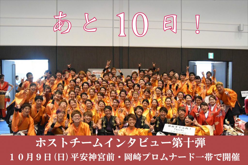 残り19日からは、京炎 そでふれ!という京都学生祭典から生まれた京都らしい創作おどりを踊る、京都の各大学にあるホストチームにフォーカスを当てます! 彼らには本祭当日、様々なステージで踊っていただきますのでぜひご注目ください! さて今日は……京都橘大学の学生で構成されている、京炎 そでふれ!Tacchiに意気込みを語ってもらいましょう! それではどうぞ!!