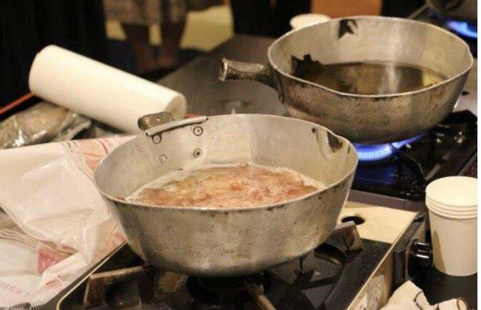 そこで今回、ブース出展に先駆け、日・中・韓各国の料理人を講師としてお招きし、京都に留学している学生とともに、 実際に各国のだしやスープを味わい、特徴や香りについての事前研修を実施しました。イベント当日は、実行委員と留学生が、 事前研修で学んだことをもとに 、3カ国4種類のだしを取って来場者にだしを振る舞い、 香りや味の違いを楽しみながら飲み比べてもらいます。/