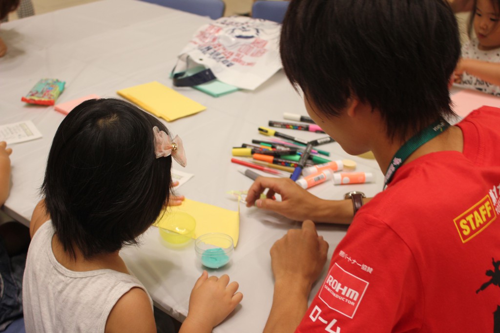工作企画は福島県の伝統工芸である風車と起き上がり小法師の作成と、京炎 そでふれ!で使用する四つ竹の小型版のちび竹の装飾を行いました。たくさんの子どもたちが工作をしてくれました。