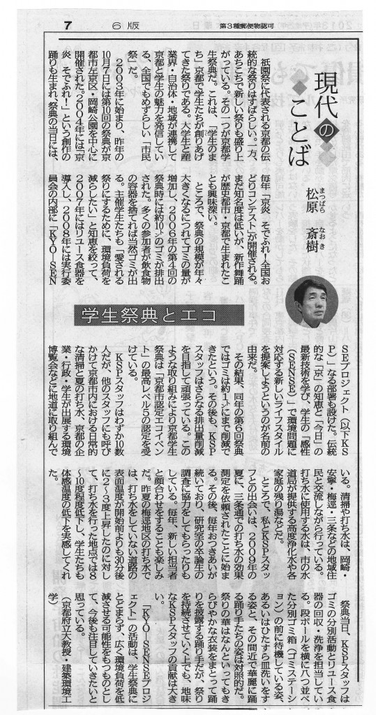 平成25年4月11日京都新聞夕刊「現代のことば」にて、京都府立大学の松原斎樹教授にご紹介いただきました。 KYO-SENSEプロジェクトについて紹介されています。 KYO-SENSEプロジェクトとは、京都に通ずる伝統文化に学びつつ、身近な生活から環境を見直し、新しいライフスタイルを提案する京都学生祭典の取り組みです。 『KYO』には様々な意味が含まれており、『京都』の伝統を継承し、『今日』の新しい技術に学び、産・学・公・地域が『協力』し、知恵と感性を出し合い、環境問題に取り組むことをねらいとしています。 詳しい内容はぜひ記事をご覧ください。