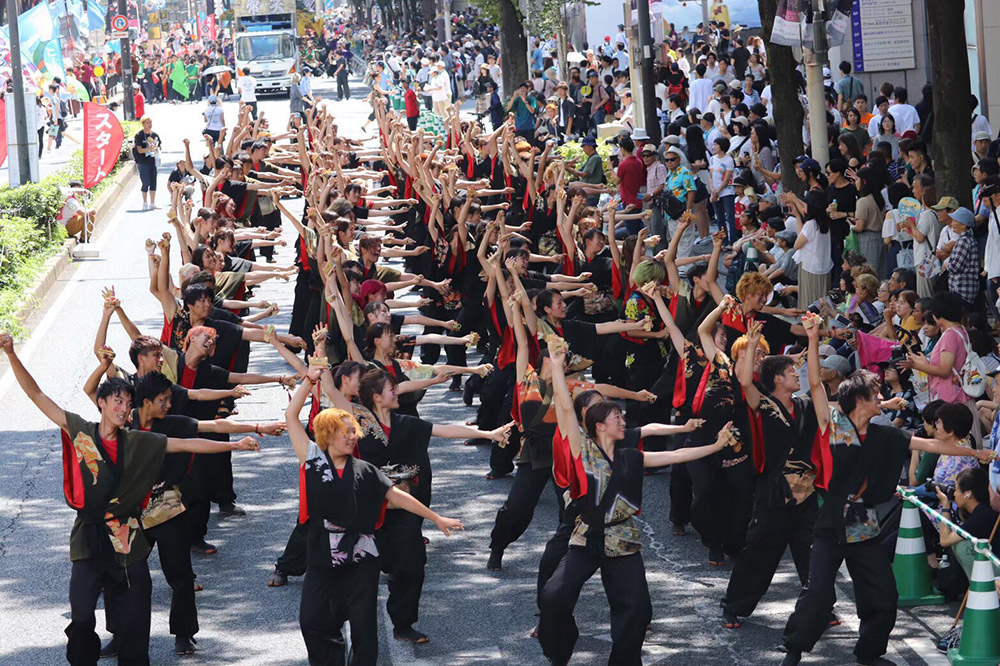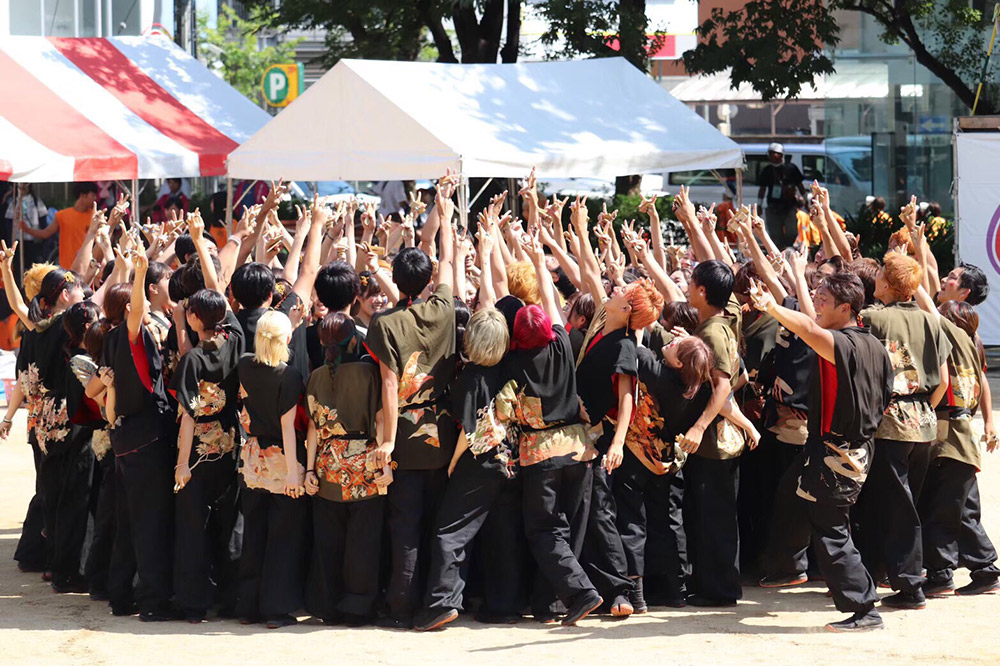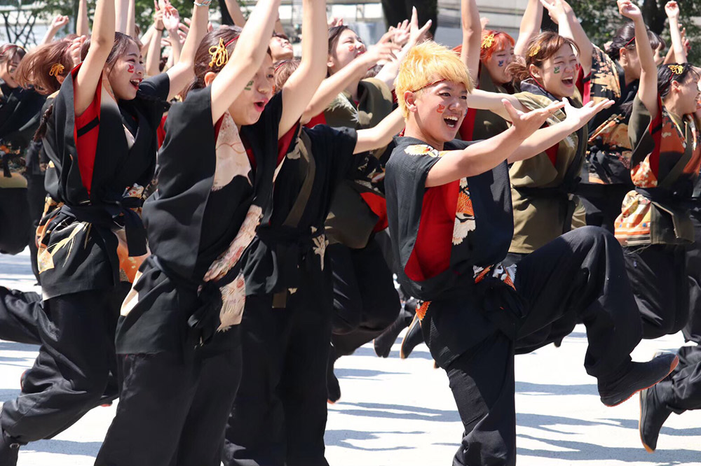 曲・振り・衣装全てに京都らしさが詰まっており、京都の文化と学生の勢いを感じることができるおどりです。 衣装には、着物の一種である留袖をリメイクして使用しており、一着一着が手作りで、それぞれが異なる柄になっています。 所要時間:約10分