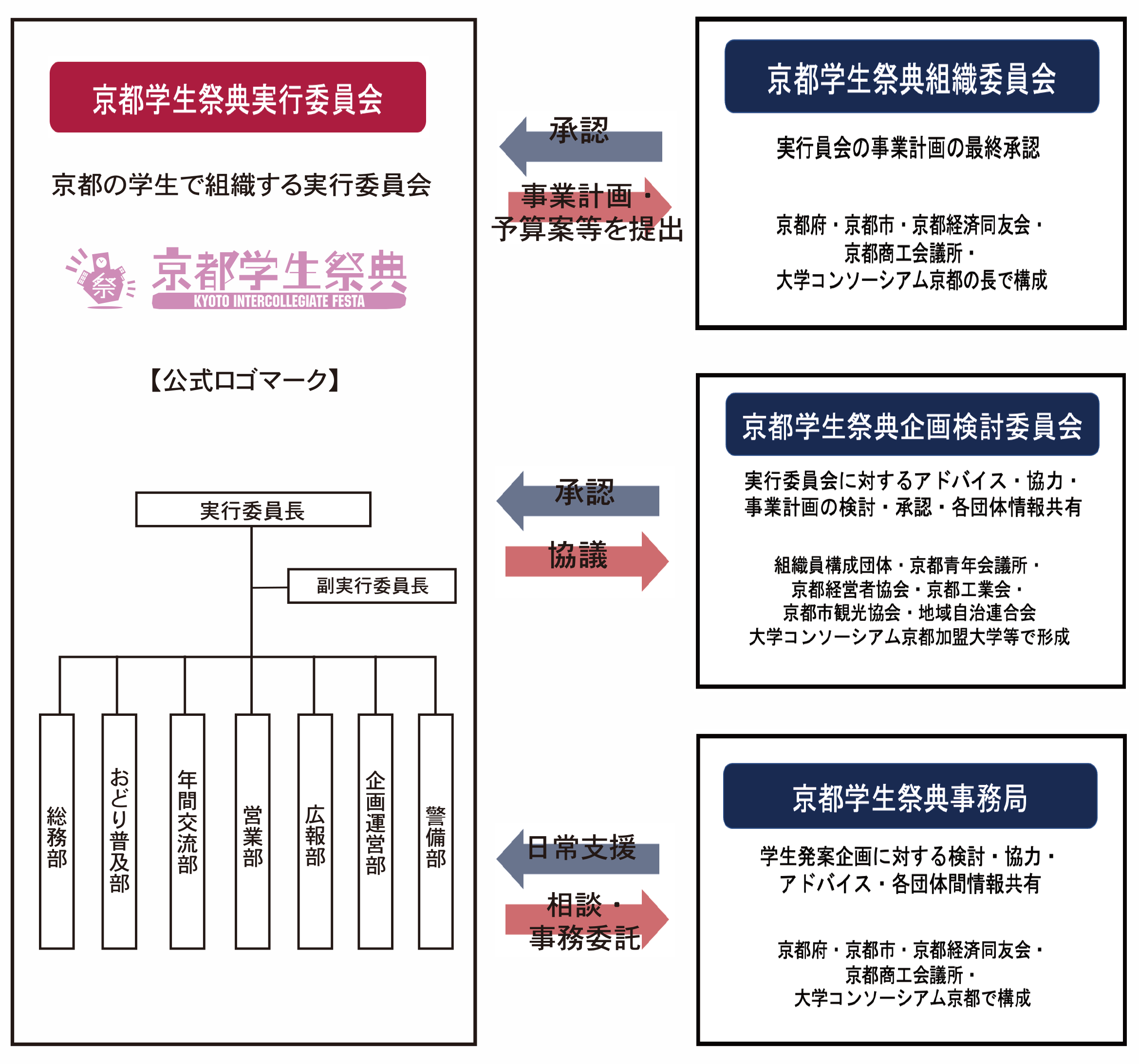 京都学生祭典は、私たち京都学生祭典実行委員会(以下「実行委員会」)が主催し、京都府・京都市・京都商工会議所・京都経済同友会・大学コンソーシアム京都の5団体に共催いただいて成り立っています。 実行委員会と各共催団体は、日頃から綿密な連携を取ることはもちろん、共催団体の皆さまを中心に構成された各種委員会にて協議を重ねることで、京都学生祭典本祭をはじめ様々な企画が実施できるようご支援・ご協力いただいております。 また、京都学生祭典実行委員会は、中心となって組織を引っ張っていく実行委員長・副実行委員長のもと、6つの部署に分かれて活動しています。 各々の部署が役割を全うしつつ協力し合うことで、幅広い活動へと繋げています。