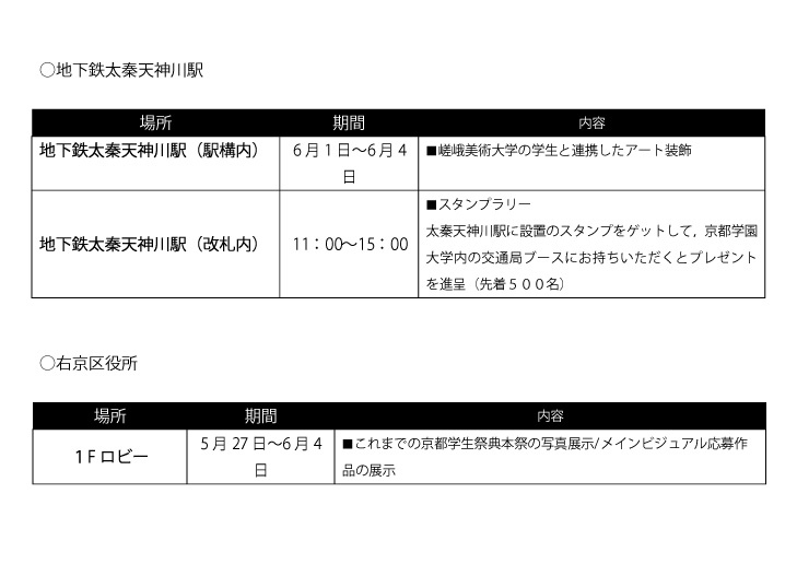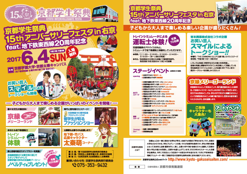 *日時:2017年6月4日(日)11:00~16:00 *場所:京都学園大学・京都太秦キャンパス(京都太秦天神川駅から徒歩3分) *入場料:無料 *共催:京都市交通局 / 学校法人京都学園大学 / 京都学生祭典組織委員会 (京都府 / 京都市 / 京都商工会議所 / 一般社団法人京都経済同友会 / 公益財団法人 大学コンソーシアム京都) *協力:右京区役所 / 社会医療法人 太秦病院