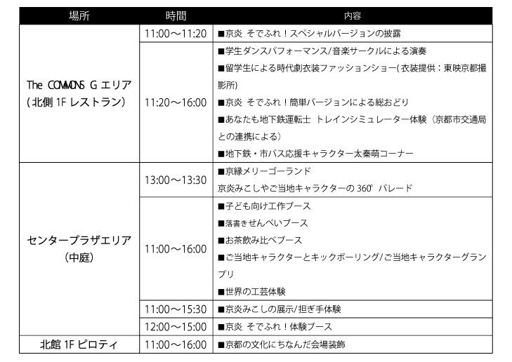当日は東映京都撮影所や、京都市も取り組む大政奉還150周年プロジェクトと連携した 「留学生による時代劇衣装ファッションショー」、「京都の文化にちなんだ会場装飾」といった京都文化を発信する企画や、 「ご当地キャラクター投票体験」「地下鉄運転シミュレーター」などの体験型ブース、 京都市営地下鉄および京都学園大学公式キャラクターのポスター展示等の企画を実施します。