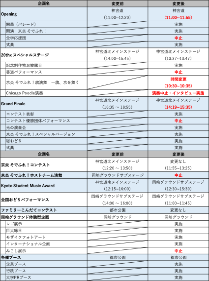 本日の京都学生祭典は天候の悪化が想定されるため、開催時間を11:00~16:00に変更して実施します。