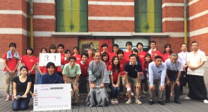 また、(公財)京都和装産業振興財団様よりお貸し頂いた浴衣を纏い平安神宮で打ち水を行いました!大勢で浴衣を着ていたためか、外国人観光客との交流もあり、楽しい打ち水となりました!打ち水という文化をこれからも残していきたいです!