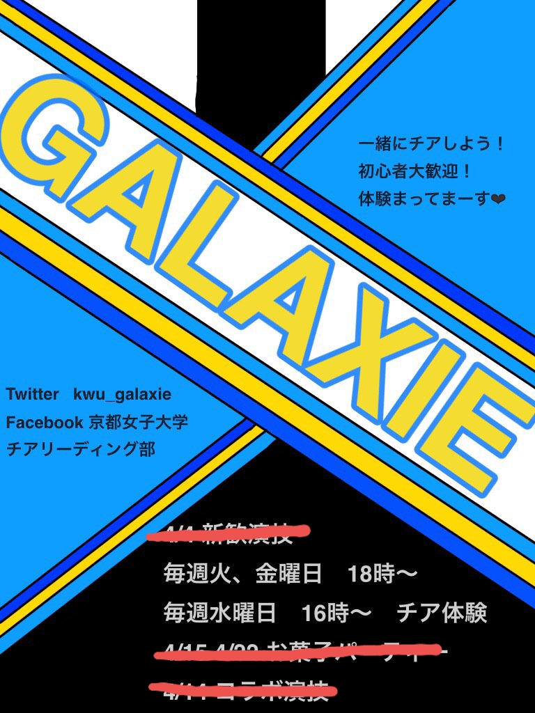 はじめまして!チアリーディング部GALAXIEです!私たちは『元気・勇気・笑顔』をモットーに楽しく活動しています!オープンキャンパスや地域のイベント、藤花祭での演技披露…
