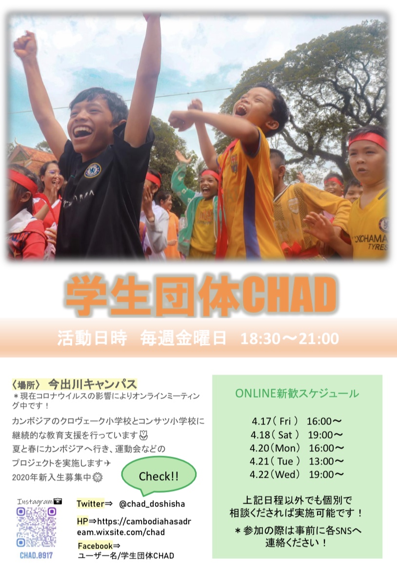 学生団体のCHADです!カンボジアの子供達のために継続的なボランティア活動をしています。普段は週に一回のミーティングを、春と夏には実際にカンボジアの小学校へ行き、現地のカンボジア人大学…