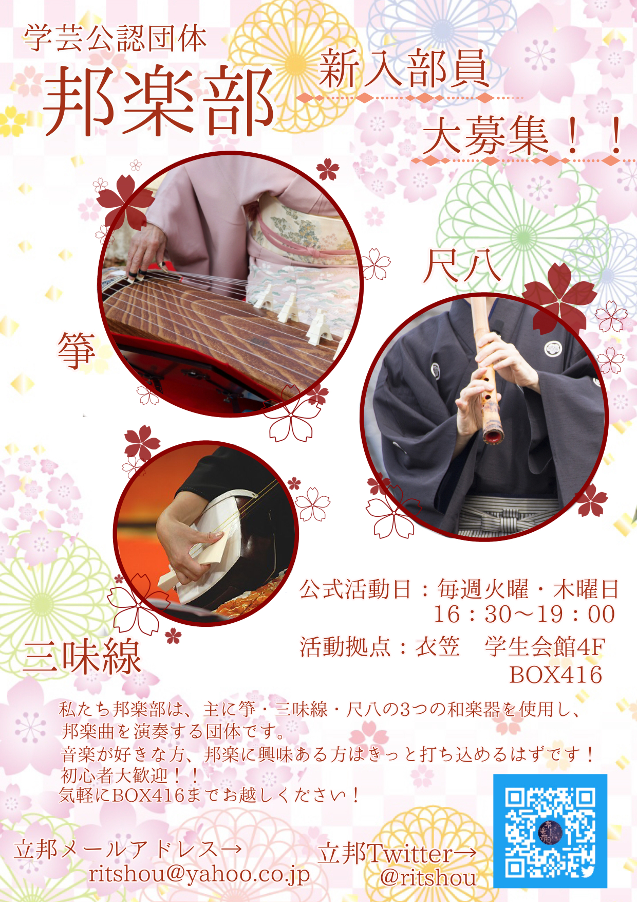 こんにちは、立命館大学邦楽部です。私たちは、箏・三味線・尺八の三つの楽器を主として、様々な邦楽曲を演奏している団体です。学内での季節ごとの演奏会だけでなく、依頼演奏も積…