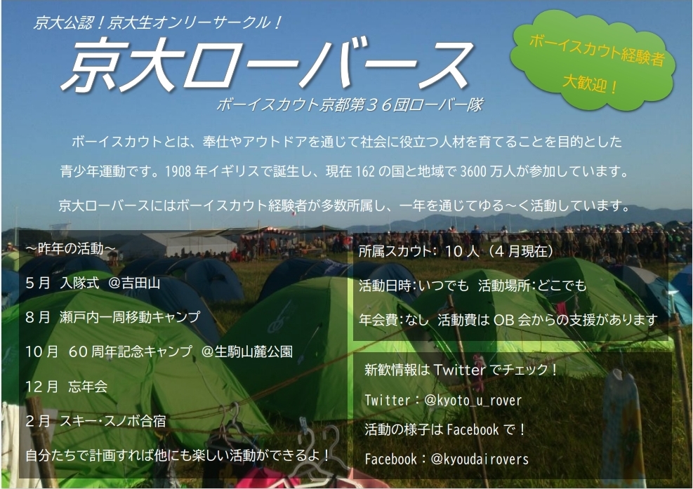 京大ローバースは、野外活動と奉仕活動を中心に活動する、大学のボーイスカウト団体です。地元の連盟と重複登録し地元の団に奉仕する傍ら、大学でものびのびと活動を楽しむボーイスカウト経験者が多く所属しています…