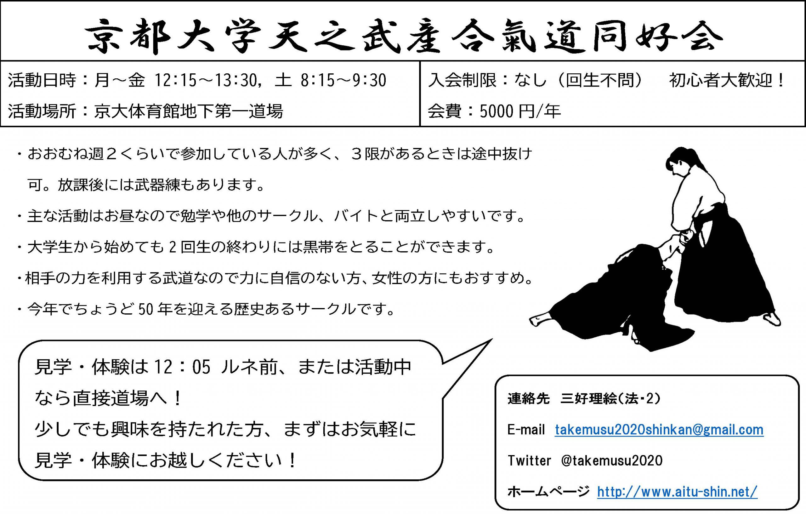 吹田にある天之武産塾合氣道々場の門下に属しており、おのおのが空いている日に体育館の地下道場にて稽古を行っています。週2くらいで活動している人が多く、学業や他のサークル、アルバイトと両立しやすいです。…