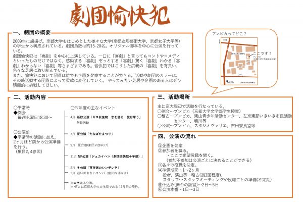 劇団愉快犯は京都大学に拠点を置く学生劇団です。その名の通り、皆さんに喜劇をお届けすべく日々活動中!ガチ過ぎず、ゆる過ぎず、楽しく演劇つくってます。規模はそれほど大きくありませんが、その分新入団員にも活…