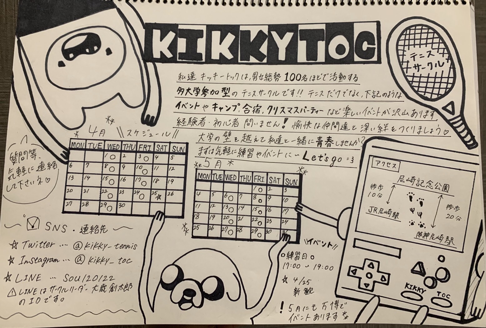 私達キッキートックは男女総勢100名程で活動するインカレテニスサークルです!テニスは尼崎市の記念公園で毎週水曜金曜の17時〜19時に行っています!入会費や年会費はありませんが、コート代を年に2回集めま…