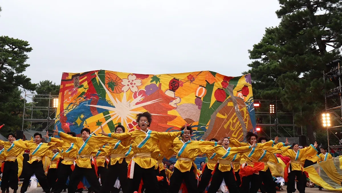 テーマが殿様の冒険ということで、殿様のお城に、伏見桃山城がモチーフとして使われております。 そして、京都を代表する清水の紅葉をよさこいで表し、和の楽器である和太鼓や、祇園祭で聞こえてくるあの祭りの音をこの演舞に詰め込みました。すべての要素が今までにないものになるよう奮闘してきたので、輪舞曲の新しさをぜひご覧ください!