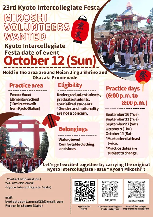 10月12日(日)に行われる第23回京都学生祭典のOpeningパレードにて参加を予定しています。応募は掲載チラシのQRコードから申し込みをお願いします。