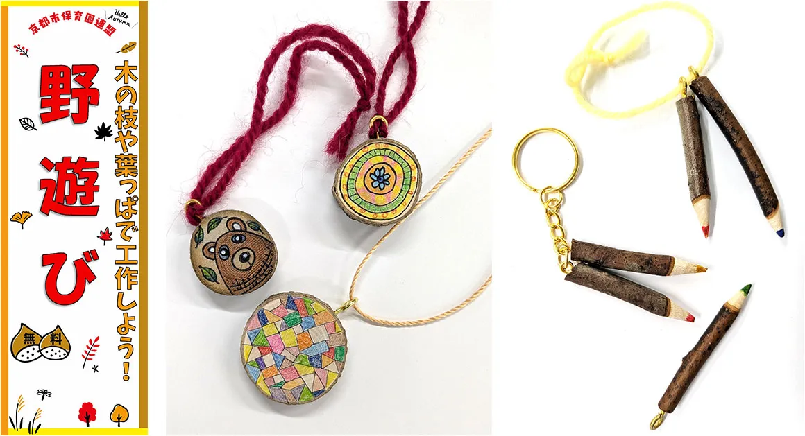 ①野あそび~木の枝や葉っぱで工作しよう~ 八瀬野外保育センターで子どもたちが日頃楽しんでいる、木の枝や葉っぱを使った工作3種類(木の枝えんぴつキーホルダー・木の輪ネックレス・葉っぱでステンシル)を作ります。