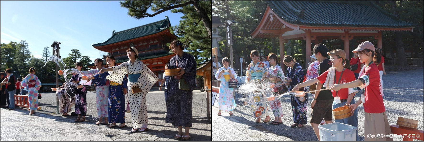 この夏、このKYO-SENSEの思いのもと、京都学生祭典はエコ活動に取り組んでいきます。その一環として、二条城前と平安神宮の2カ所で打ち水イベントを行います。