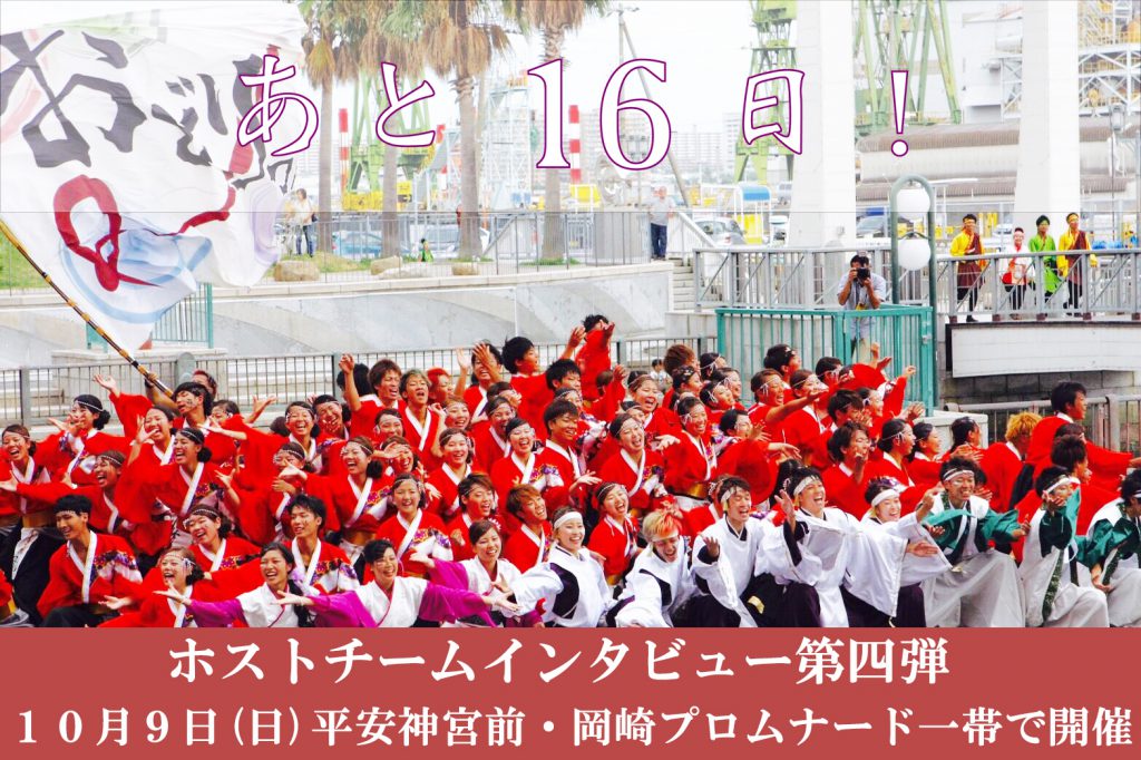 残り19日からは、京炎 そでふれ!という京都学生祭典から生まれた京都らしい創作おどりを踊る、京都の各大学にあるホストチームにフォーカスを当てます! 彼らには本祭当日、様々なステージで踊っていただきますのでぜひご注目ください! さて今日は……立命館大学の学生で構成されている、京炎 そでふれ!おどりっつに意気込みを語ってもらいましょう! それではどうぞ!!