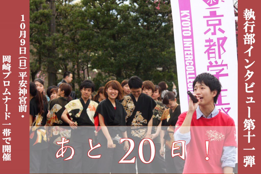 最初の11日間は、執行部と呼ばれる京都学生祭典実行委員会の7つの部署の部長と3人の副実行委員長、実行委員長にフォーカスを当てます! さて今日は……実行委員長に想いを語ってもらいましょう! それではどうぞ!!