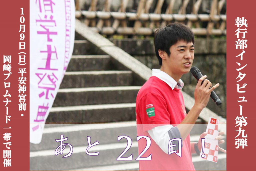 最初の11日間は、執行部と呼ばれる京都学生祭典実行委員会の7つの部署の部長と3人の副実行委員長、実行委員長にフォーカスを当てます! さて今日は……2人目の副実行委員長に想いを語ってもらいましょう! それではどうぞ!!