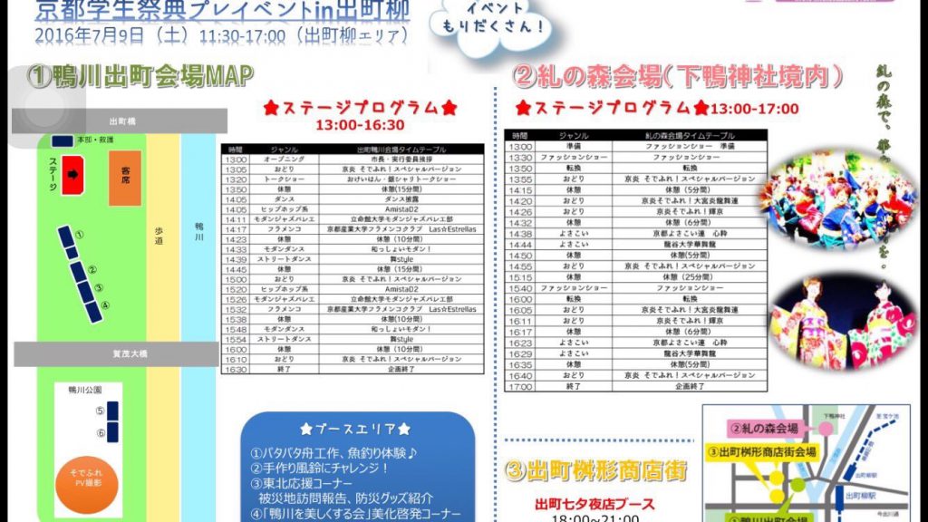 本日の出町柳のプレイベントのタイムテーブルに一部変更がございます。 鴨川会場での13時5分からの京炎 そでふれ!スペシャルverの演舞 14時17分〜と15時32分からのフラメンコの披露 が中止となりました。 当日のタイムテーブルはこちらとなります。