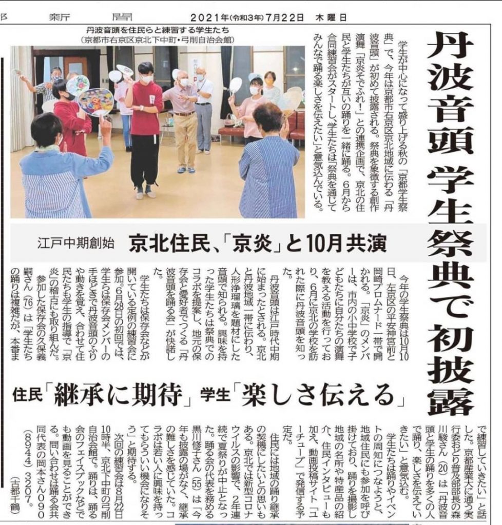 7月22日、京都新聞の朝刊におどり普及部の活動が掲載されました!☀️