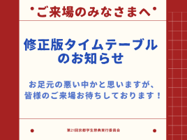 10月8日 (日) 実施予定の第21回京都学生祭典本祭は天候不良のためタイムテーブルを変更しての開催となります。 修正版タイムテーブルなどの詳細については後ほど公式ホームページ、各種公式SNSにて発表致しますのでご確認頂 […]
