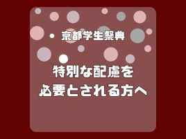 【第22回京都学生祭典(2024年10月13日実施)にご来場いただく特別な配慮を必要とされる方へ】 第22回京都学生祭典の中で行われます各種企画等へご参加いただくにあたり、何か特別な 配慮を必要とされる方は、2024年1 […]