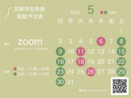 【5月に京都学生祭典について説明会を行います!!!】 《※緊急事態宣言中はzoomで説明会を行います。》 2021年10月10日(日)に平安神宮前・岡崎プロムナード一帯で行われる 『第19回京都学生祭典』を運営する実行委 […]