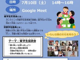 7月10日(土)に行う第2回留学生交流会への参加留学生を募集しています! コロナ感染対策を考慮し、Google meetを使ったオンライン形式での実施となります。 今回のテーマは「留学生座談会」です! ・来てほしい母 […]