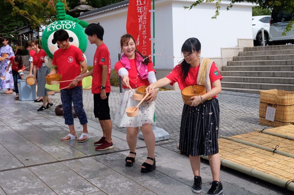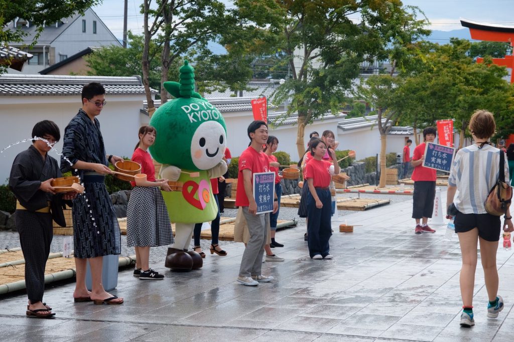 8月8日(水)に伏見稲荷大社にて打ち水を実施いたしました! 「DO YOU KYOTO?」でおなじみの京都市 環境マスコット、エコちゃんも駆けつけてくれました! 打ち水と同時に、京都学生祭典のチラシも配布しまし、京都をエコにしながら、 多くの方に京都学生祭典のことも知っていただくことができました! 次回は8月22日 (水)平安神宮前にて、打ち水を行いますのでぜひお越しください!