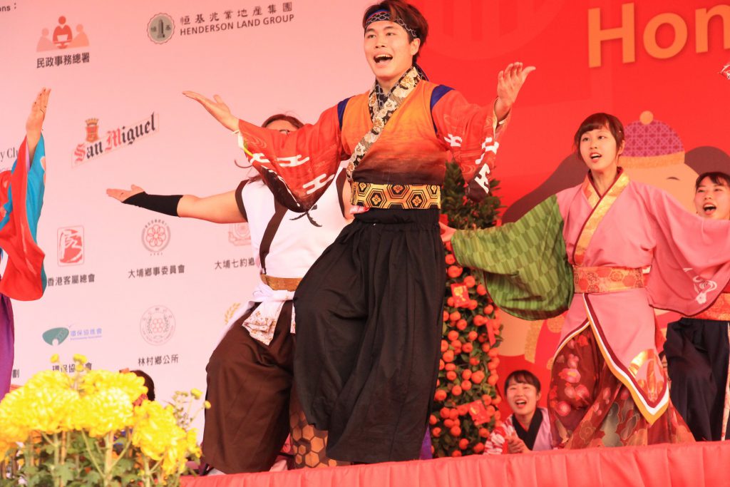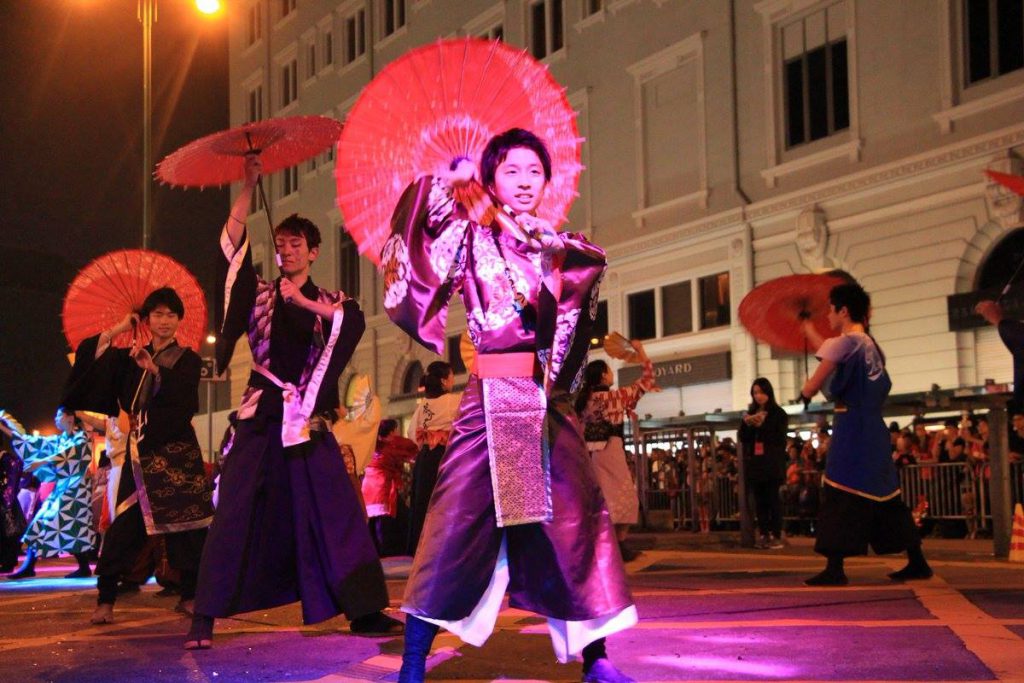 「京炎 そでふれ!」は、2月16日(金)のナイトパレードと17日(土)のステージパフォーマンスにて、 毎年10月に開催している京都学生祭典本祭等で披露しているおどりを今回のパレード用に アレンジしたスペシャルバージョンの演舞を披露しました!