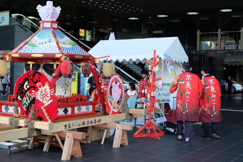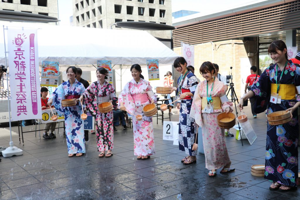 駅前広場では学園祭ブースや京炎みこし展示を行いました。 子ども向けのブースでは子どもたちの笑顔があふれていました。 また楽曲に合わせた書道パフォーマンスや、打ち水企画を行いました。 京都駅の目の前ということもあり多くの方に見ていただくことができました。