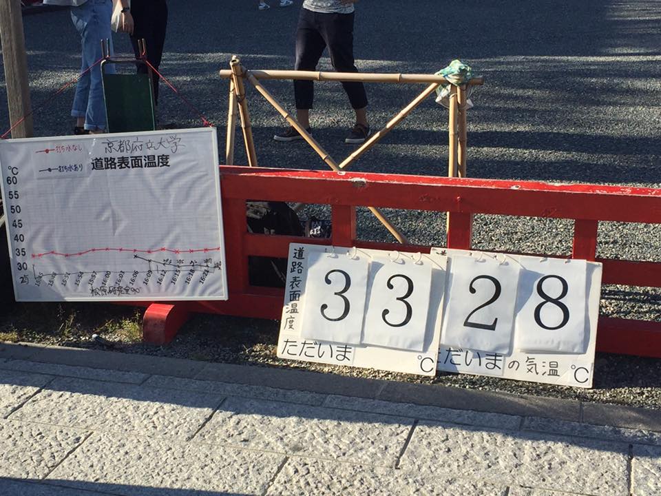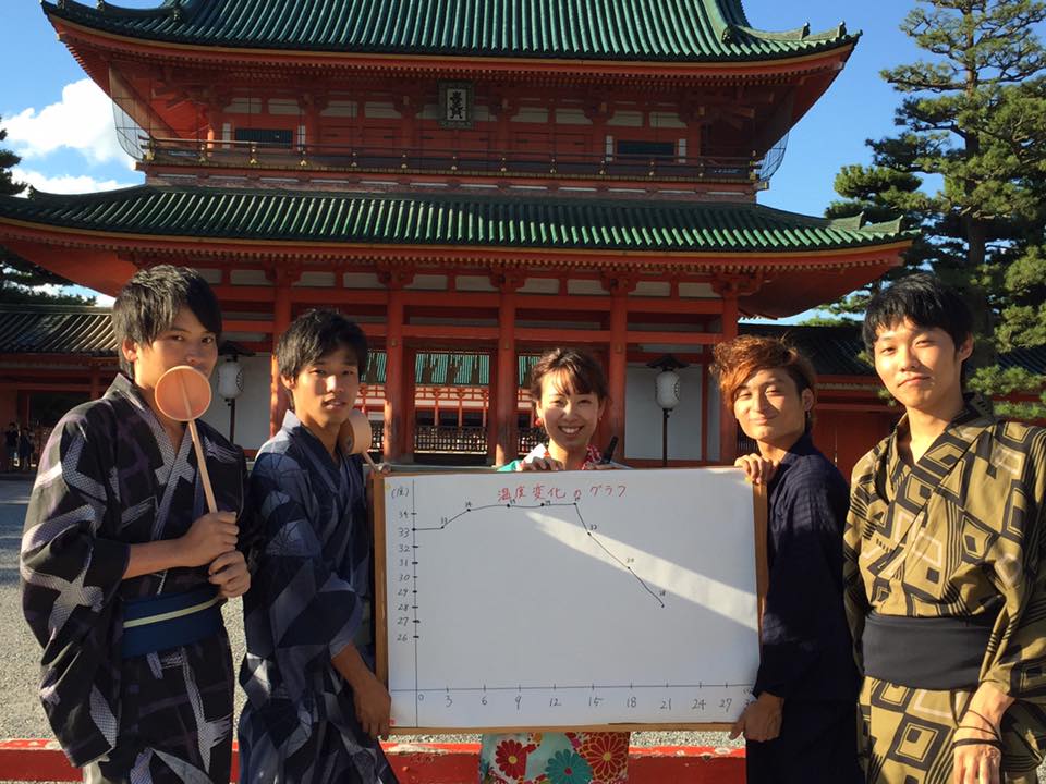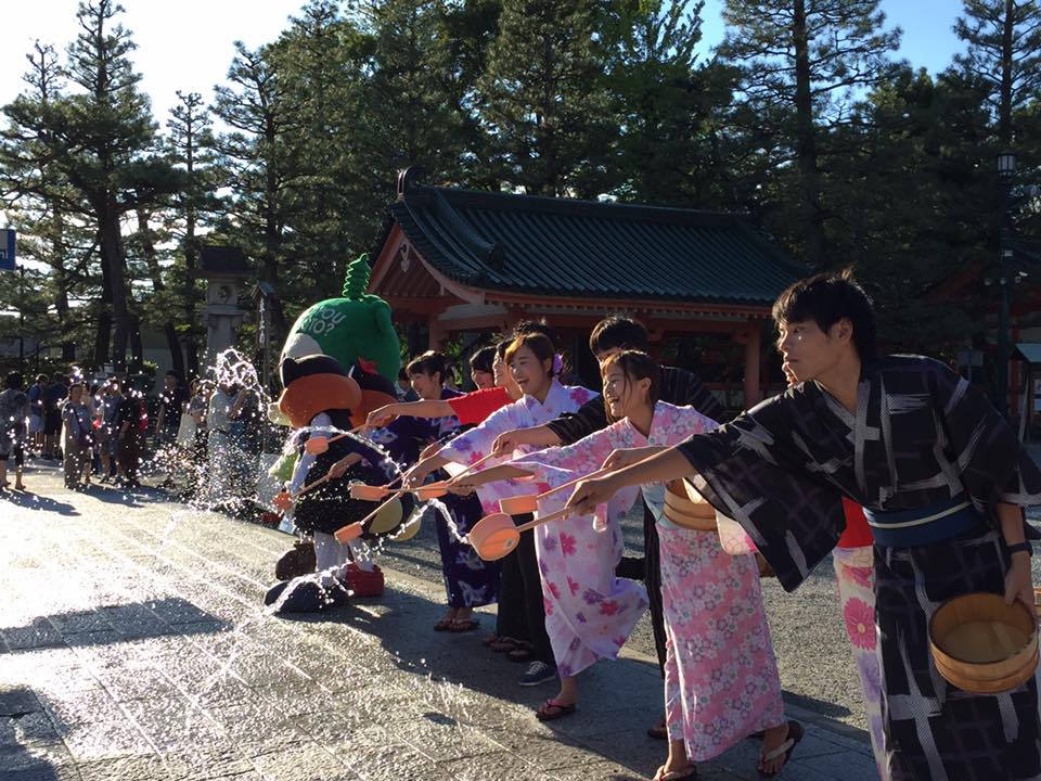 打ち水実施直後は34度と暑かったですが徐々に打ち水の効果が表れ始め、なんと35度あった気温が最終的は28度まで気温を下げることが出来ました! 京都学生祭典本祭まで残り1ヶ月と少しになりますが、これからも頑張ってまいります!