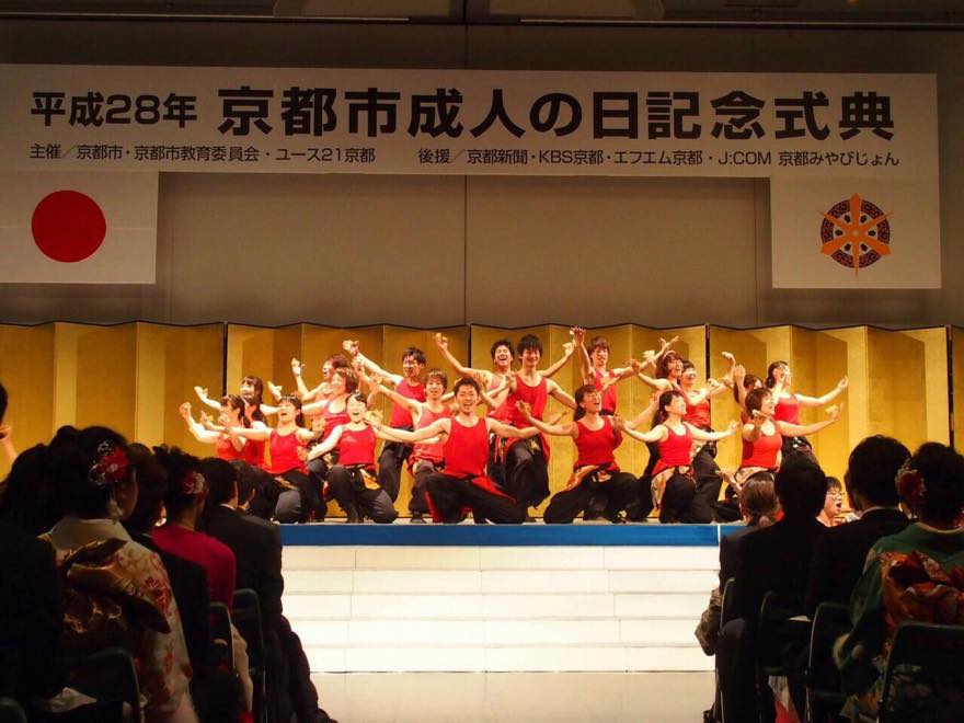 1月11日(月)みやこめっせで行われた、京都市成人の日記念式典にて京炎 そでふれ!の披露をさせていただき、新たな門出を迎えられた新成人の皆さんをお祝いすることができました。 何千人の前でおどらせていただく貴重な場で、おどり手一同緊張しながらも最後までしっかり元気と笑顔を届けておどりきりました。