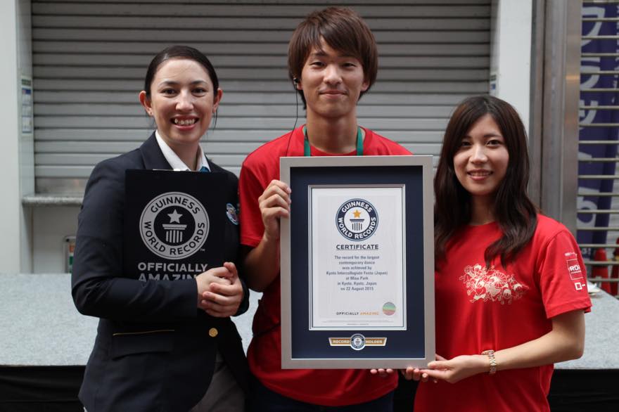 こんばんは! 私たちおどり普及部は 第3回京都学生祭典から生まれたオリジナル創作おどり“京炎 そでふれ!”を 京都から全国・世界へ発信していく部署です。 年間約300回のおどり披露・出前教室を実施させて頂き、 京都市成人式や京都サンガ戦などでも披露をさせて頂いております。 今年の8月には伏見七商店街と京都学生祭典とのコラボ企画 「世界への挑戦 in 伏見」にて多くの方々のご協力の下、 Largest contemporary dance部門で 京炎 そでふれ!がギネス世界記録™を達成しました。 以下はギネスワールドレコーズジャパンの公式HPの記事ですので、 ご参照ください。 http://www.guinnessworldrecords.jp/news/2015/8/largestcontemporarydance