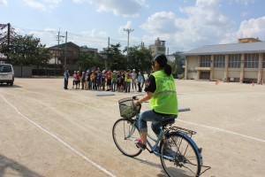 最後に、二人乗り・傘さし運転・スマートフォンを見ながらの運転の危険性を、子どもたちが実際に体験していました。 障害物のないグラウンドで行ったにも関わらず、バランスがとれなかったり、前を見れなかったりしてとても危険であることを実感し、この運転を公道で行ったことを想像すると、もっと危険であると感じました。 自転車に乗っていて歩行者と事故を起こした場合、加害者になるのは自分ですし、多額の賠償金を支払うケースもあるようです。 これは、子どもたちに言えることではなく、大学生も自転車のマナーが悪いと言われていますし、京都で生活する上で、自転車は欠かすことのできない生活必需品だと思います。 これから自転車に乗るときは、今以上に十分気を付けて、交通ルールを守って乗りたいと感じました。 警備部 兼先勇佑