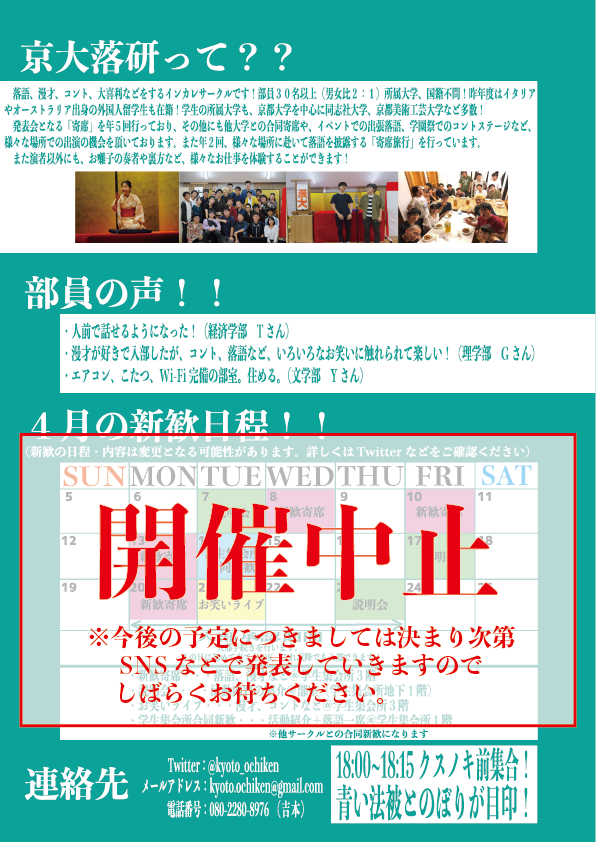 当サークルでは、年に5、6回寄席を開催しており、その中では落語だけでなく、漫才や三味線漫談のような色物が行われたりもします。また、他にも地域の老人ホームや小中学校から依頼を受けて、落語を披露するという活動も行なっております。ほとんどの部員が落語なんて聞いたことがない、漫才なんてやったことがないというところからスタートするので、安心して入部してください!漫才、裏方だけやりたいという人も大歓迎です!