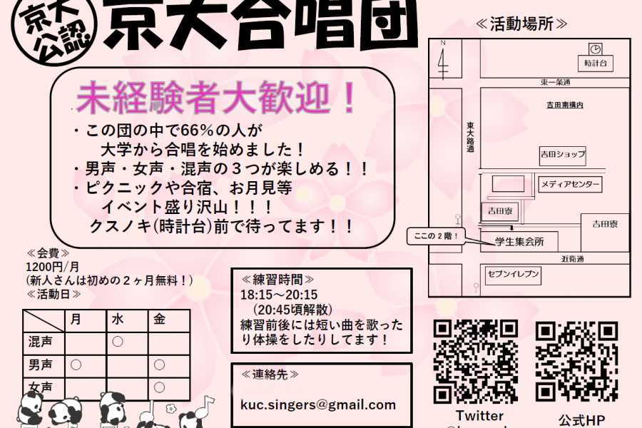 混声、女声、男声の三形態で活動している京大公認のインカレ合唱サークルです♪みんなそれぞれの合唱ライフを楽しんでいます!