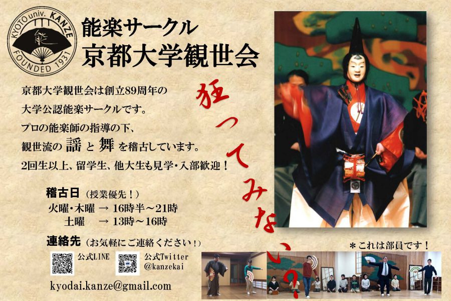 「能は地味なんかじゃない。肉体的で、ストイックで、精神的で、哲学的で…めちゃくちゃかっこいい。」 能を楽しく稽古するサークルです。学生の能サークルでは最大規模のイベント「京都大学観世能」主催。本物の能舞台で舞ったり、装束・面をつけたり、京都のディープスポットで飲んだり…。一風変わった体験がしたい、大学で新しくハマれるものがほしい、演劇、音楽、古典、哲学などに興味がある、そんなあなたにおすすめです!