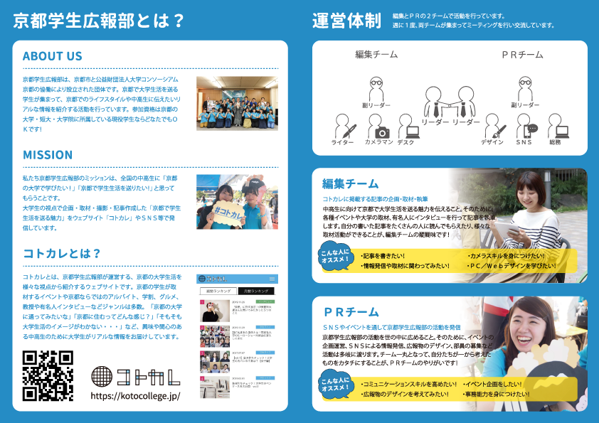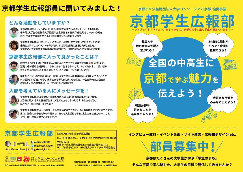 大学生の視点から、京都での学生生活や、京都ならではのイベントの記事、京都に関わる有名人のインタビュー記事など、様々なジャンルの記事を書き、ウェブサイト『コトカレ』やSNSで発信し、広める活動をしています。