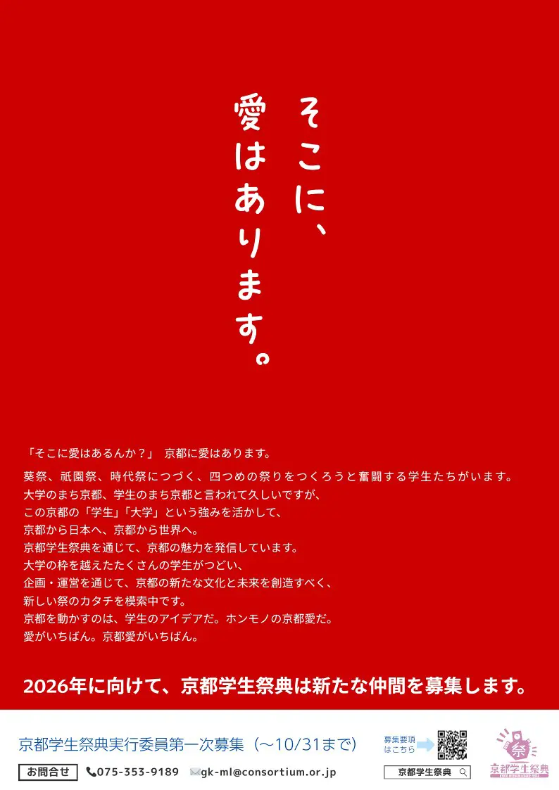 「そこに愛はあるんか?」 京都学生祭典に京都愛があります。 葵祭、祇園祭、時代祭につづく、四つめの祭りをつくろうと日夜がんばっています。 大学のまち京都、学生のまち京都と言われて久しいですが、 この京都の「学生」「大学」という強みを活かして、 京都から日本へ、京都から世界へ。 2003年からずっと途絶えることなく、 毎年10月に平安神宮一帯で開催される京都学生祭典を通じて、 京都の魅力を発信しています。 大学の枠を越えたたくさんの学生がつどい、 ダメなものは変えればいい、ないものは創ればいい。と、 意見をぶつけ合ってもお互いに高め合い、 より良いものを目指すが故に、意見が合わないなんていつものこと。 企画・運営を通じて、京都の新たな文化と未来を創造すべく、 ミライにつながる京都ならではの祭りをめざして奮闘中です。 そして、数々の困難を乗り越えて、ついにやり遂げた後は、 言葉にはできない達成感があります。 感動と笑顔を、京都中の大学から集まった実行委員や、 支援してくれる関係者の皆さまと一緒に分かち合いたくて、 今日も一生懸命活動しています。 京都を動かすのは、学生のアイデアだ。ホンモノの京都愛だ。 愛がいちばん。京都愛がいちばん。