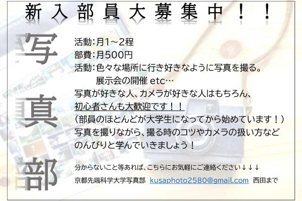 主な活動は週に1回のミーティングと月に2回の撮影会です! 皆初心者なのでカメラを使ったことがない人でも大歓迎です!お気軽にご連絡ください!