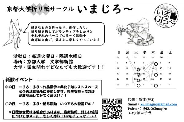 関西圏唯一の折り紙サークルです!京大生が主ですが、他大学生も幅広くいます。初心者も二回生以上も大歓迎です。